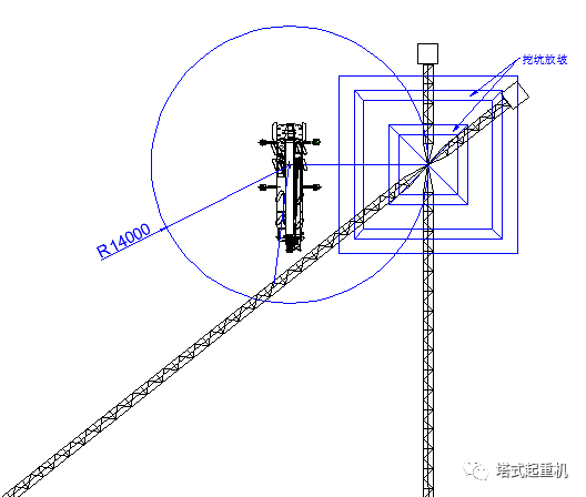 汽车吊的选型与汽车吊就位的位置与塔机基础之间的相对距离存在着直接的关系。汽车吊可就位的位置越远,那么在安拆同一种型号的塔机的时候,所需要选择的型号越大。从图1与图3相比较,因为图3基础处于-6.00m(假设是地下室底板处于同一水平标高),在制作这台塔机的基础时,一般的处理方式就是如图3所示,进行土层放坡。这样带来的直接的后果,就是汽车吊可就位的位置在比预期要远很多,势必会增大所选汽车吊的型号。