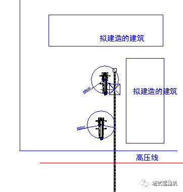 如果塔机的基础处于深基础坑内(假设标高为-15.00m),同时其安装的方案受到拟建造的建筑的影响,如图6所示,使得其安装方向仅能向南。而若南边正好又有一根高压线,那么在塔机安装时,塔机一次性安装的塔身高度需要超过高压线一定的安全高度(根据高压线的电压值来确定需要达到的安全高度)。于是汽车吊安装的时的臂长的要求就很高了。这样在对汽车吊选型的时候,臂长与起重量就是关键性的因素。
