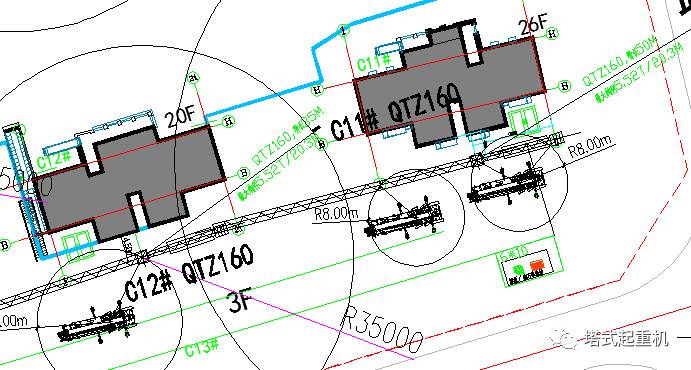 上图中C11#塔机的拆卸过程就是一个非常典型的、没有各种不利因素的情况:塔机降节时不存在有施工电梯或者其他建筑物的干涉;汽车吊的就位位置下方不是地下室顶板(图上标蓝线的范围之内),而且有足够多的场地用于汽车吊撑开支腿;塔机拆卸后的部件也有足够多的场地放置。所以在选择汽车吊的时候只需要考虑大约7~8m的幅度能够吊装塔机的最大部件的重量即可。像这个QTZ160塔机的最大部件是平衡臂6.28t,所以选择25t汽车吊也能勉强可以拆卸了(25t汽车吊在主臂选择24.4m,幅度在7m时,起额定起重量为7.2t)。但是为了保险起见,选择50t汽车吊拆卸具有更大的安全系数。