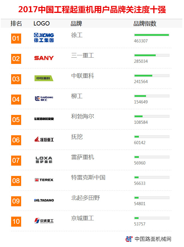 2018年1月8日,中国路面机械网在北京发布了《2017年工程起重机用户品牌关注度排行榜》。这是继2009年中国路面机械网首次推出工程起重机用户品牌关注度排行榜以来,连续第十年推出该榜单。